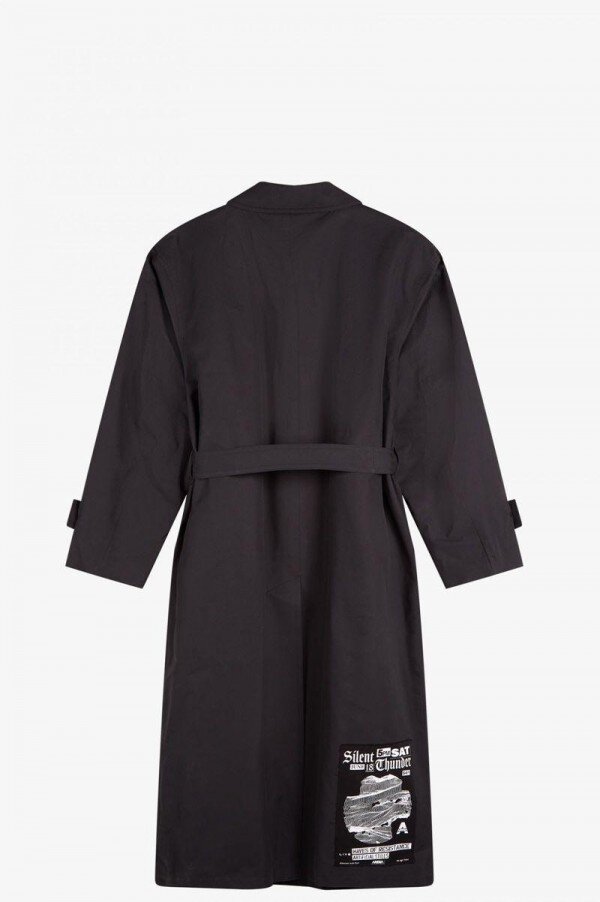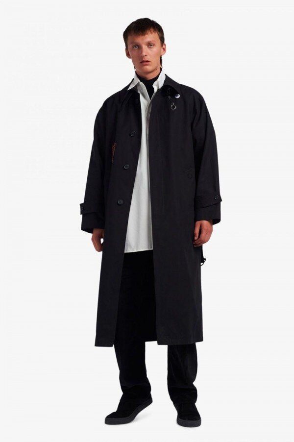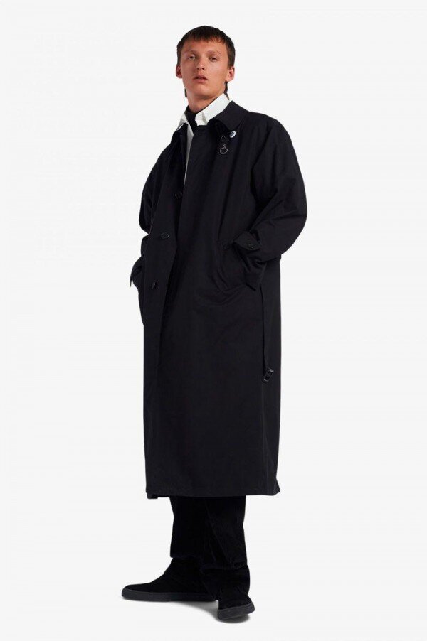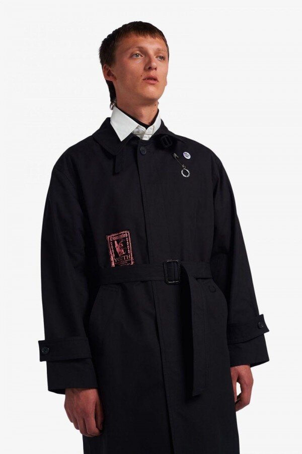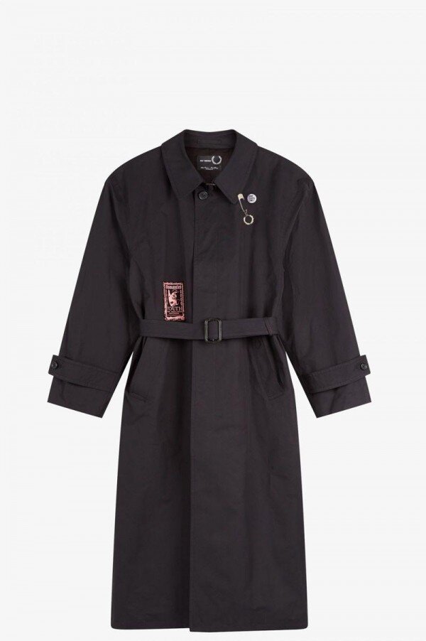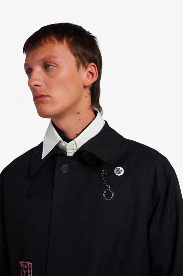 Simons reinterprets familiar Fred Perry silhouettes with the sensibilities of his eponymous line and decorated with unique artworks created by graphic artist Tom Tosseyn. Harnessing the DIY spirit of music scenes from punk to new wave, and celebrating the ephemera of fictional live music venues, Simons’ take on the belted trench coat is constructed from a soft cotton garbadine, that was made in London. Features include customised details including sewn on patches and a bright silver metal pin-badge and Laurel Wreath charm. A reimagined classic, that combines conventional style with a rebellious spirit. To wear the Fred Perry x Raf Simons collection is to feel part of something – the power of youth and belonging.