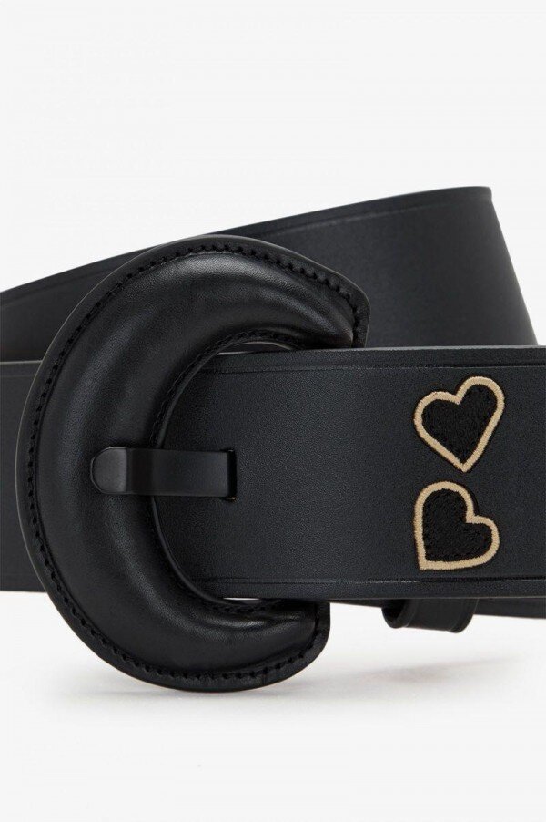 A leather belt featuring signature Amy love hearts and Laurel Wreath branding on the belt keeper.