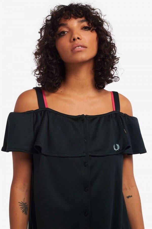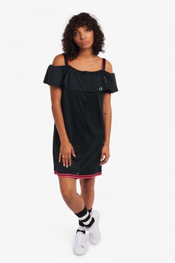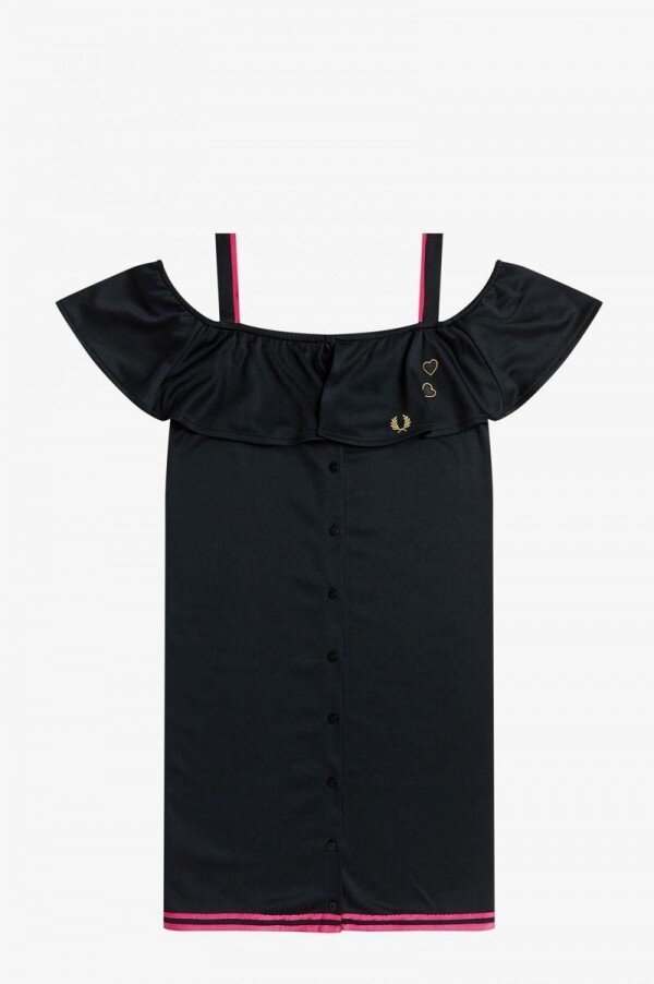 Whether she was at home on the streets of Camden, performing her music on world stages, or styling herself for photoshoots, Amy was synonymous with the Laurel Wreath. Rooted in the singer’s sportswear and pin-up silhouettes, we’ve reinterpreted some of the key styles she used to love the most, in collaboration with the Amy Winehouse Foundation. Channelling her love of classic Americana, our Off-The-Shoulder dress is a silhouette that wouldn’t look out of place on some of the American girl groups of the ‘50s and ‘60s that Amy drew inspiration from. Key features include front-button opening, tipping detail at the hem and two signature love hearts above the Laurel Wreath, a reference to Amy’s distinctive tattoos. We continue to work with the Amy Winehouse Foundation, supporting the charity’s vital work and donating with each collection.