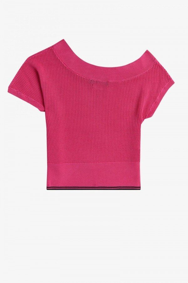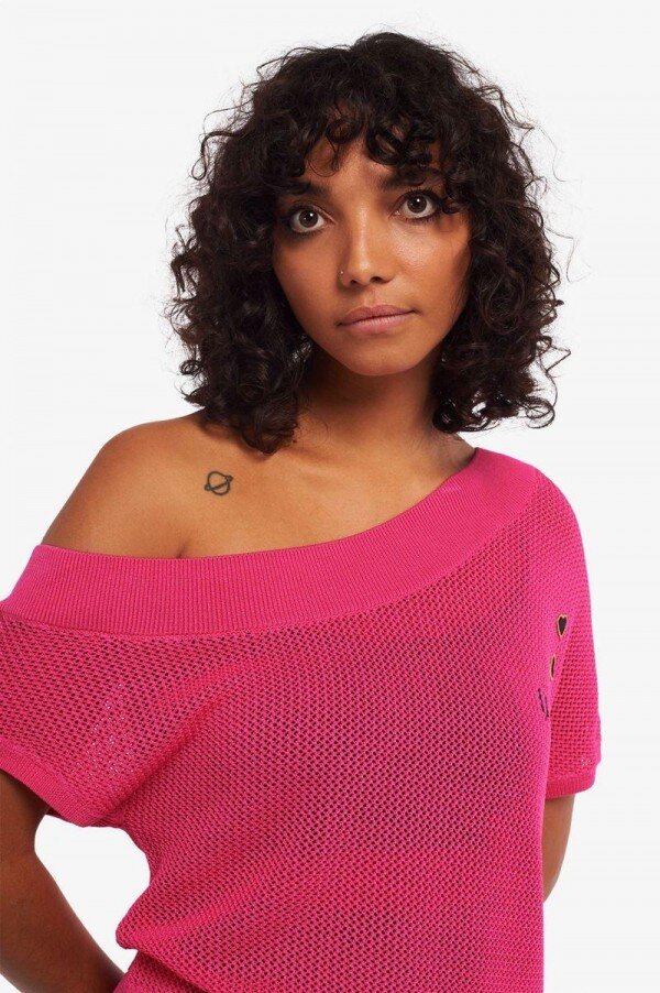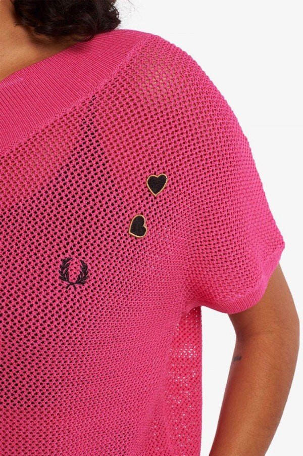 Viscose/nylon blend / Fitted one-shoulder design / Open mesh knit technique / Twin tipping on hem rib / Amy embroidered heart patches